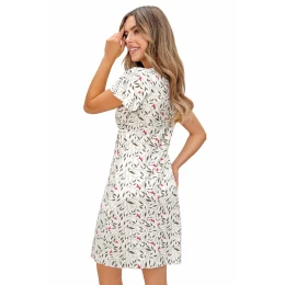 Koszula nocna damska Melisa kr/r to połączenie subtelnej elegancji i wyjątkowego komfortu. Wykonana z wysokiej jakości wiskozy z dodatkiem elastanu, jest miękka, przewiewna i doskonale dopasowuje się do sylwetki. Idealna zarówno na ciepłe noce, jak i całoroczny komfort snu. Model zachwyca delikatnym, kwiatowym printem, który nadaje całości świeżości i kobiecego uroku. Dekolt w kształcie litery „V” został obszyty subtelną koronkową tasiemką, podkreślając romantyczny charakter koszuli. Krótki rękaw typu motylek dodaje lekkości i swobody, a delikatnie marszczona gumka pod biustem pięknie modeluje sylwetkę oraz zapewnia wygodne dopasowanie. Długość przed kolano sprawia, że koszula nocna Melisa jest komfortowa i praktyczna, a jednocześnie bardzo kobieca. Model dostępny w szerokiej gamie rozmiarów od S do 2XL. Produkt pakowany w foliowy worek.