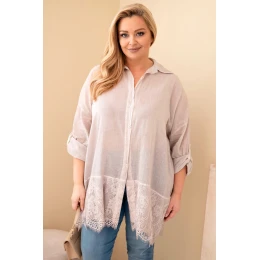 Dámská košile Plus Size bavlněná s krajkovým lemem světle béžová