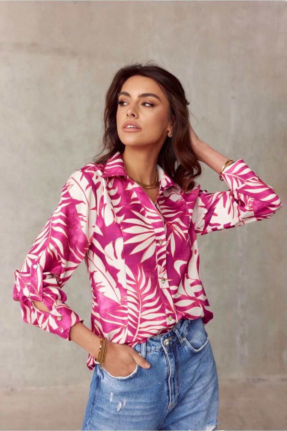 Košile klasického střihu s límečkem má ohrnuté rukávy. 3/4 rukávy se zapínáním na knoflíky zakončené manžetami. Košile má véčkový výstřih, který umně odhaluje jeho plochu, díky čemuž se budete cítit žensky s noblesou. Vpředu se zapíná na malé knoflíčky. Je ideálním základem pro mnoho outfitů, ke kterým si můžete vzít vypasované džíny, rozšířené kalhoty nebo elegantní sukni, která vám dodá charakter. Výrobek je vyroben a ušit v Polsku.