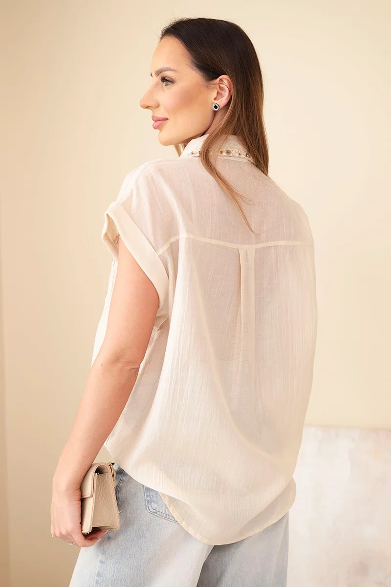 Dámská košile z model 22048779 s ozdobným límečkem a kapsami tmavě béžová - K-Fashion
