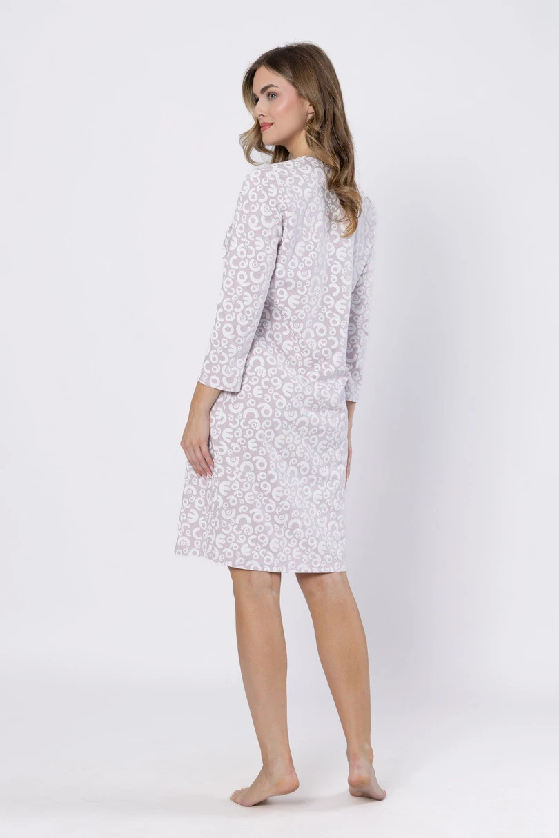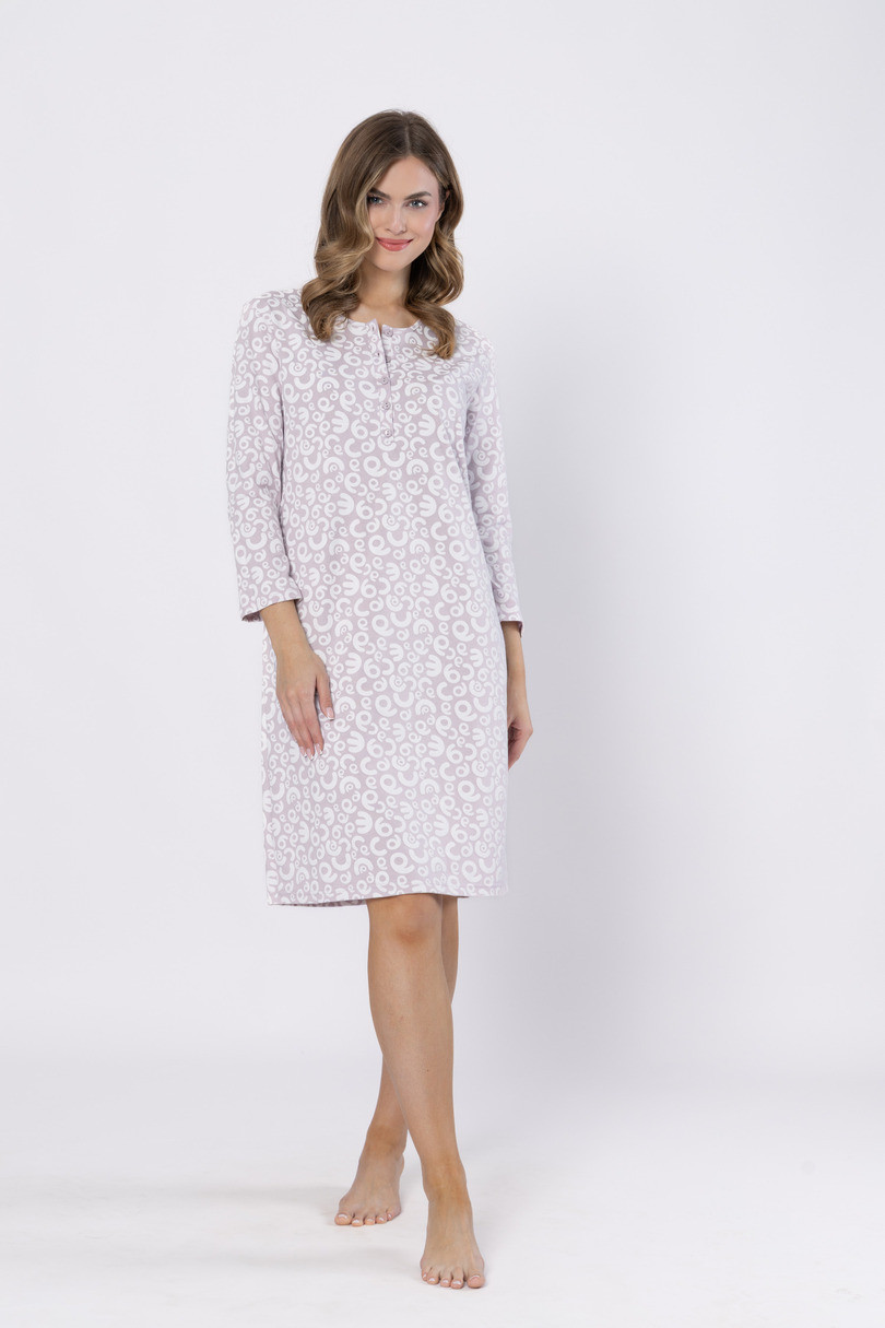 Dámská noční košile LeaveZA ZUZA 1616 je kombinací pohodlí, ženského stylu a vysoké kvality. Je vyrobena ze 100% měkké, prodyšné bavlny a zajišťuje pohodlný spánek a volnost pohybu. Model je v délce ke kolenům, má 7/8 dlouhé rukávy a kulatý výstřih. Košile je udržována v jemné lila barvě a její povrch zdobí jemný, nepravidelný vzor s písmeny. Dalším akcentem je ozdobný rub, který dodává celku na eleganci. Ideální pro ženy, které ocení klasiku a pohodlí. K dostání ve velikostech M–XL.
