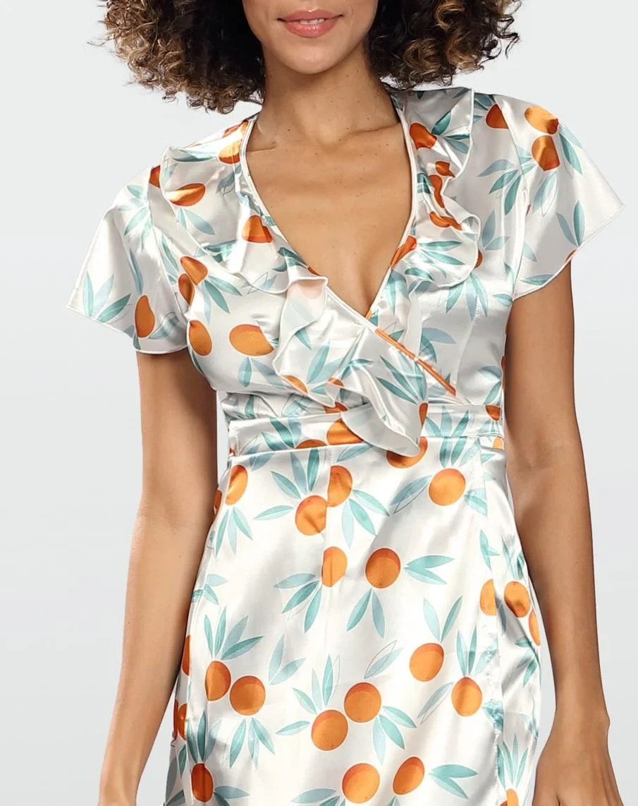 Když je léto, je nejlepší zvolit to, co upoutá pozornost. Tyto šaty jsou lehké, filigránské a ženské. Světlý, perleťový satén s potiskem Středomoří. Výstřih je zvýrazněn volánkem a na zádech je zavazování. Složení: 100% polyester.
