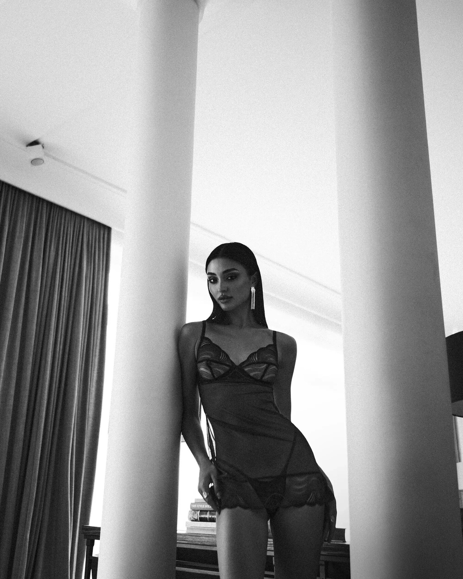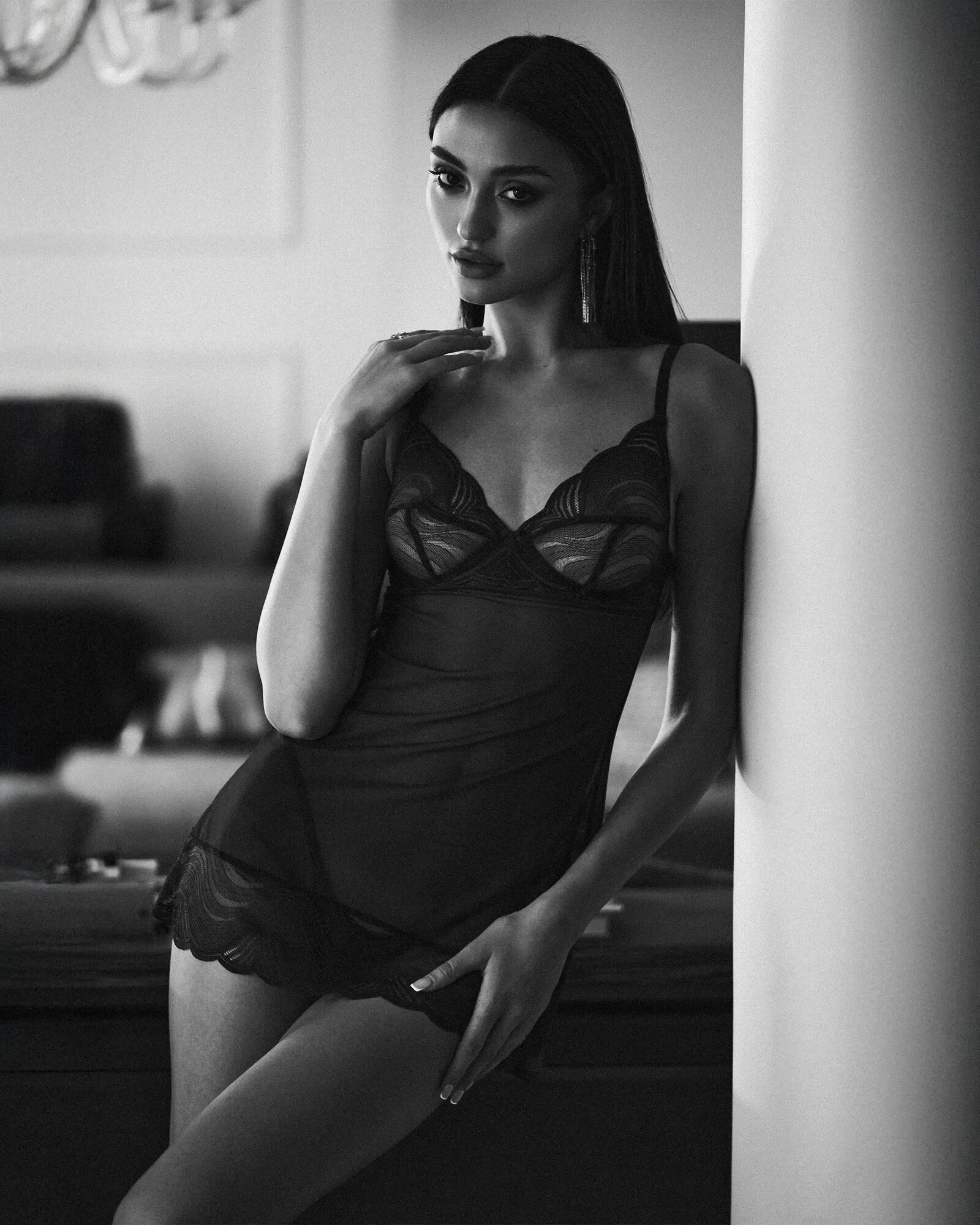 Objevte kouzlo soupravy Nightly Blue, kde nadčasová elegance a smyslný půvab vytvářejí dokonalou harmonii. Tato tmavě modrá košilka, vyrobená z měkké, průsvitné síťoviny, má jemné krajkové detaily a vlnitý okraj, který elegantně zdůrazňuje vaši postavu. Její krátký, koketní střih zvýrazňuje vaši siluetu, zatímco ladící tanga z luxusní krajky dodávají soupravě nenuceně svůdný vzhled.