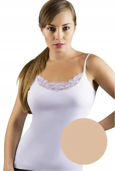 Košilka má úzká ramínka. Výstřih modelu zdobí vsadka z efektní plastické krajky.
