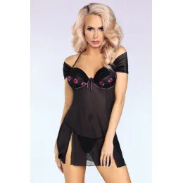 Erotická košilka Kastalia LivCo - z nejjemnějšího tylu a krajky - košíčky zdobené krajkou - v dekoltu saténová služka - ramínka se zavazují za krkem - délka košilky pod zadeček - součástí jsou tanga