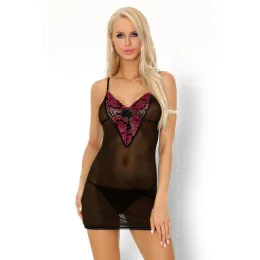 Velmi ženská a nesmírně smyslná černá noční košilka z elastického tylu. Poloprůhledná, okamžitě vzbudí mužskou fantazii. Přiléhavý střih, tenká a nastavitelná ramínka, výstřih zdobený krajkou v odstínu fuchsie. Tanga jsou součástí balení. 90 % polyamid, 10 % elastan.