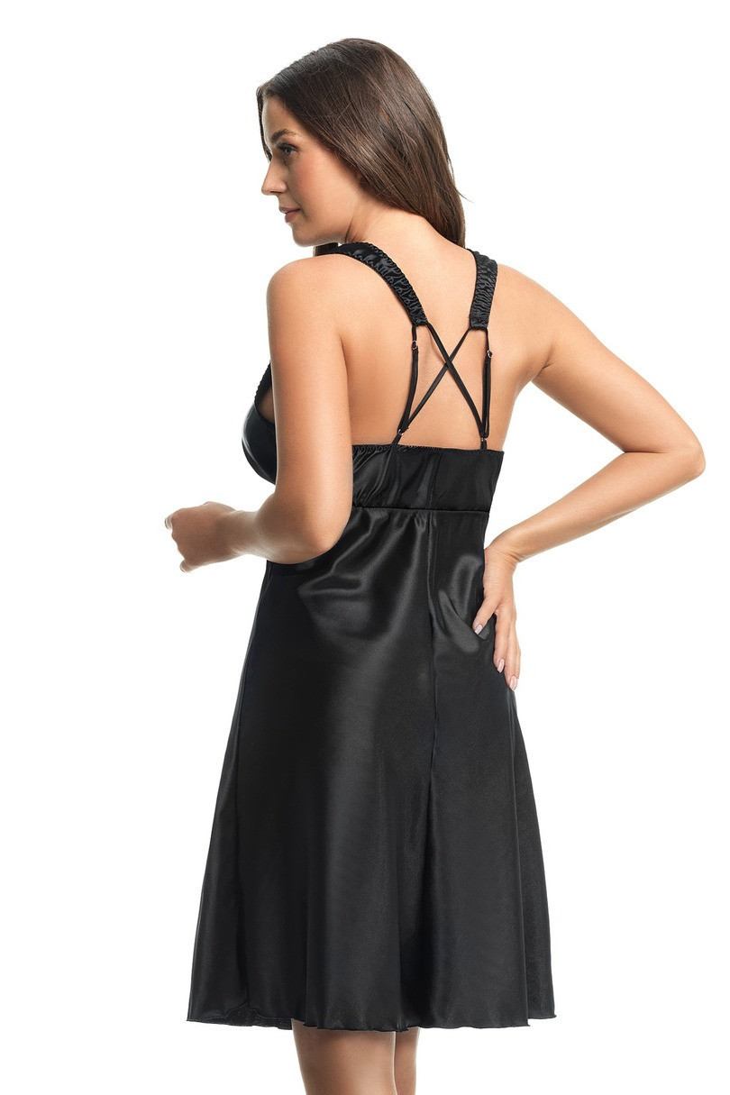 Košilka je vyrobená z lehce lesklého saténu. Výstřih modelu je ozdobený pružnou krajkou ve stejné barvě. Stejnou barvu má i trojúhelníková vsadka z krajky pod košíčky. Pod poprsím je všitá tenká gumička, která udržuje poprsí na žádoucím místě. Široká ramínka je možné vzadu nastavit. Ramínka vzadu zdobí zajímavé šněrování. Košilka je k dostání v široké škále velikostí - od S do 5XL. Model využijete jak na spaní, tak i jako spodničku.