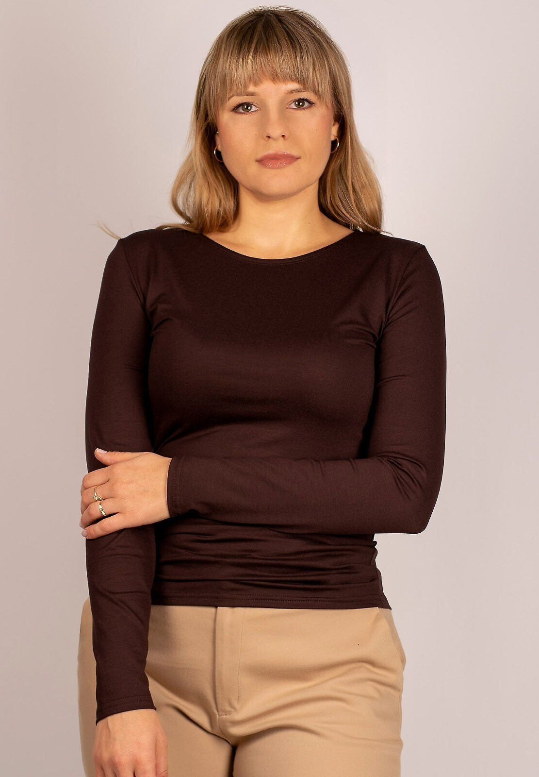 Model má dlouhé rukávy a dokonale se přizpůsobuje tělu.