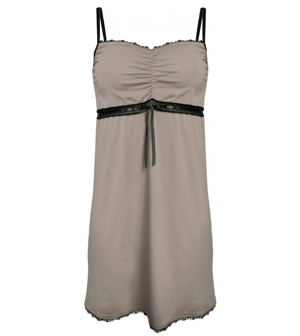 Jemná, mírně vypasovaná noční košilka ušitá z měkké viskózy. Střih s mírným řasením na prsou, zakončený ozdobným lemováním - působí jemně a žensky. Složení: 95% viskóza, 5% elastan.