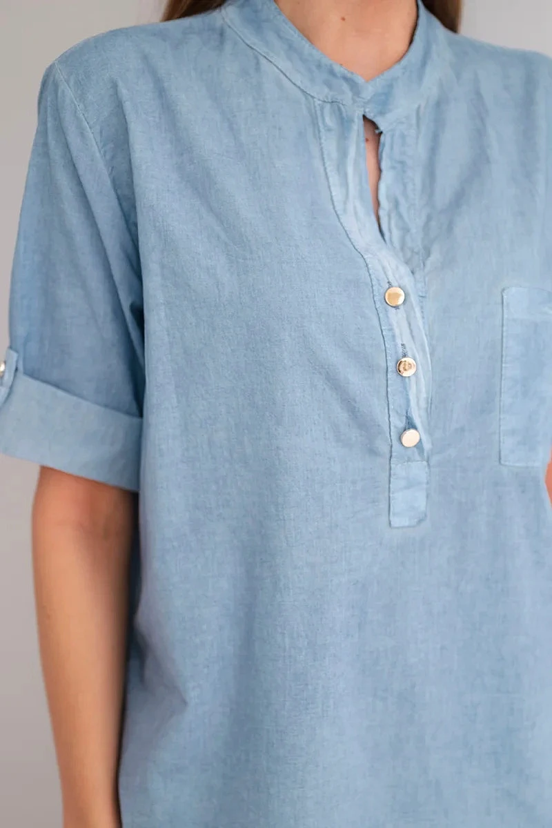 Košile je vyrobena z vysoce kvalitní bavlny s přídavkem elastanu, díky čemuž je materiál příjemný na dotek, prodyšný a dobře přiléhá k postavě. Model má módní polokulatý výstřih s krátkým zapínáním na knoflíky, které mu dodává elegantní charakter. Praktická náprsní kapsa a rukávy s možností vyhrnutí a zapnutí na knoflík podtrhují moderní a funkční styl. Je to ideální košile na jaro, léto a teplejší dny. Italská výroba zaručuje vysokou kvalitu zpracování a módní design inspirovaný italskou módou.