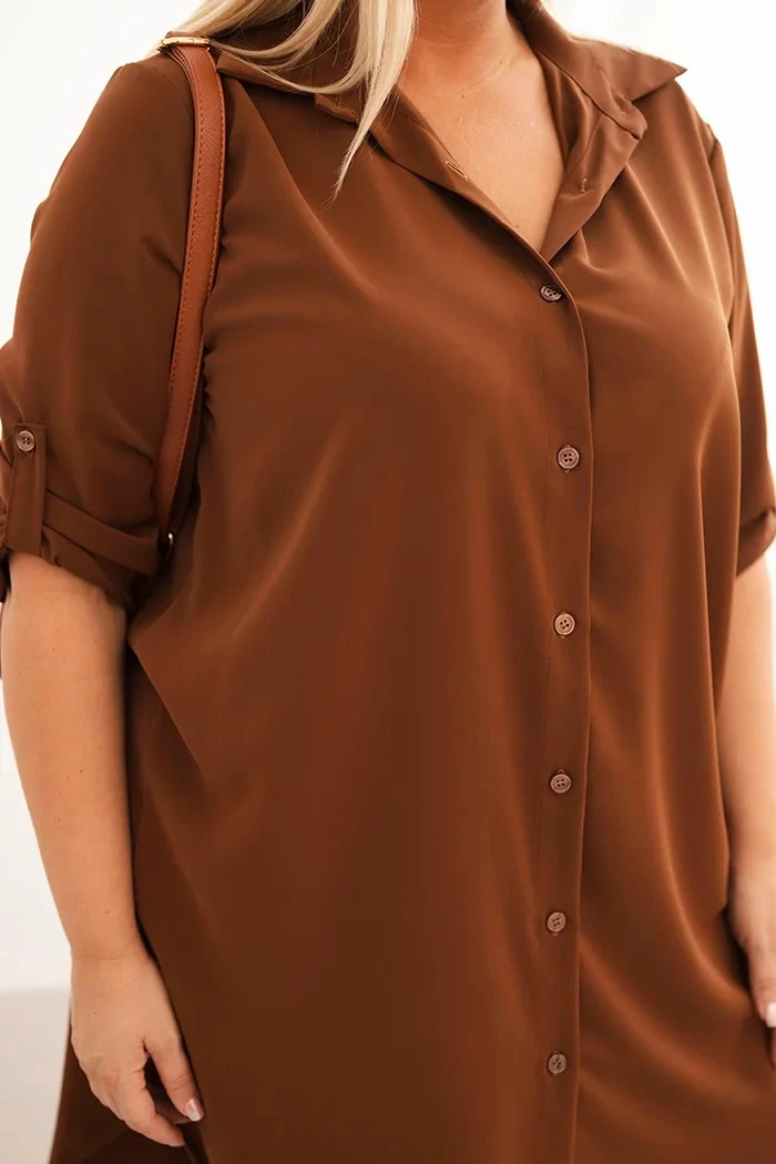 • Dámská košilová šaty Plus Size s delším zadním dílem a ohrnutým rukávem tmavě camelová