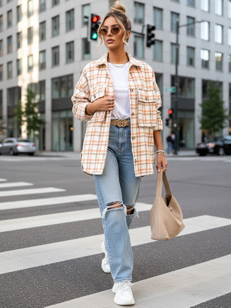 - Wzór w kratę - uniwersalny styl pasujący do codziennych zestawów
