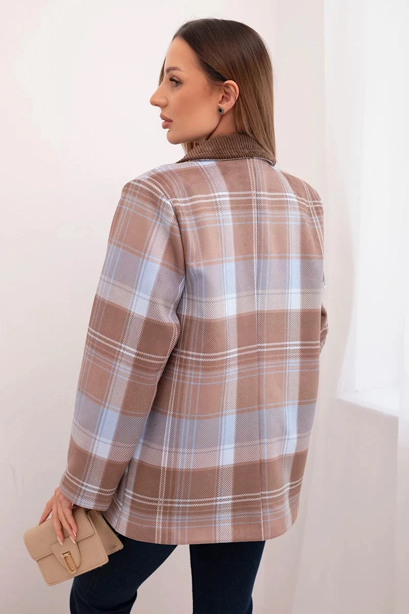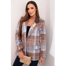 Tato dámská sako v módním kostkovém vzoru je kombinací elegance a moderního stylu. Vyniká krásnou barevností, klasickým střihem a pečlivým zpracováním. Model má ozdobnou brož, která dodává jedinečný charakter a zvýrazňuje stylizaci. Límec vyrobený z kontrastní tkaniny dodává saku originalitu. Ideální do elegantních, pracovních i casualových outfitů.