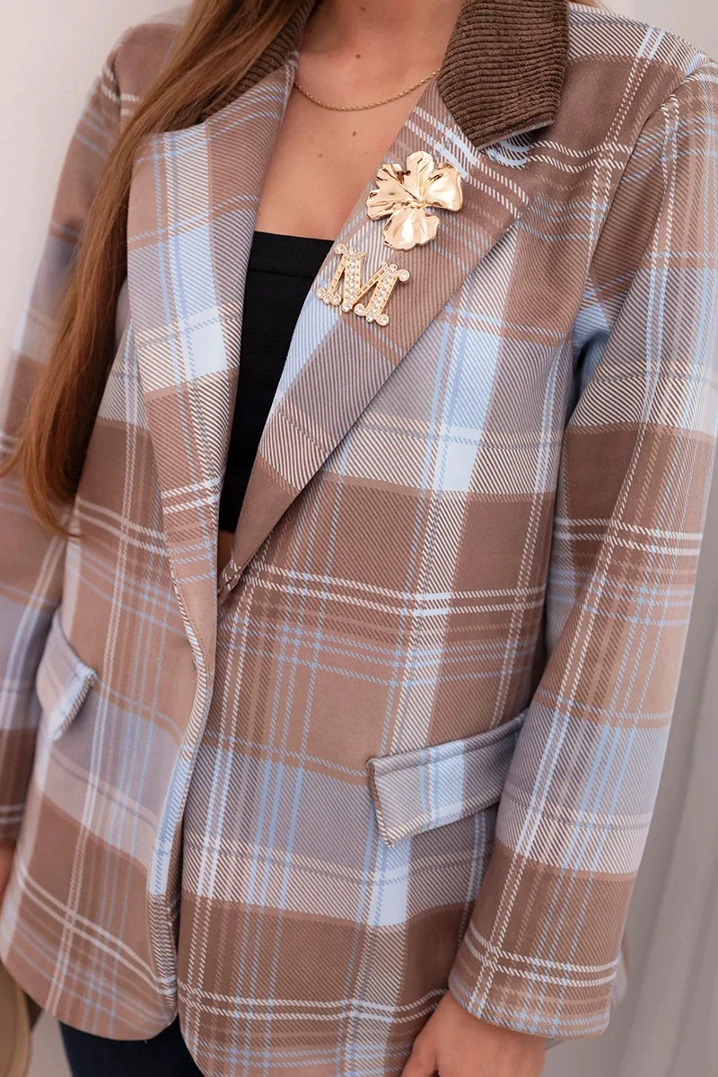 Dámská kostkovaná sako se model 21798609 broží a dlouhým rukávem modrá - K-Fashion