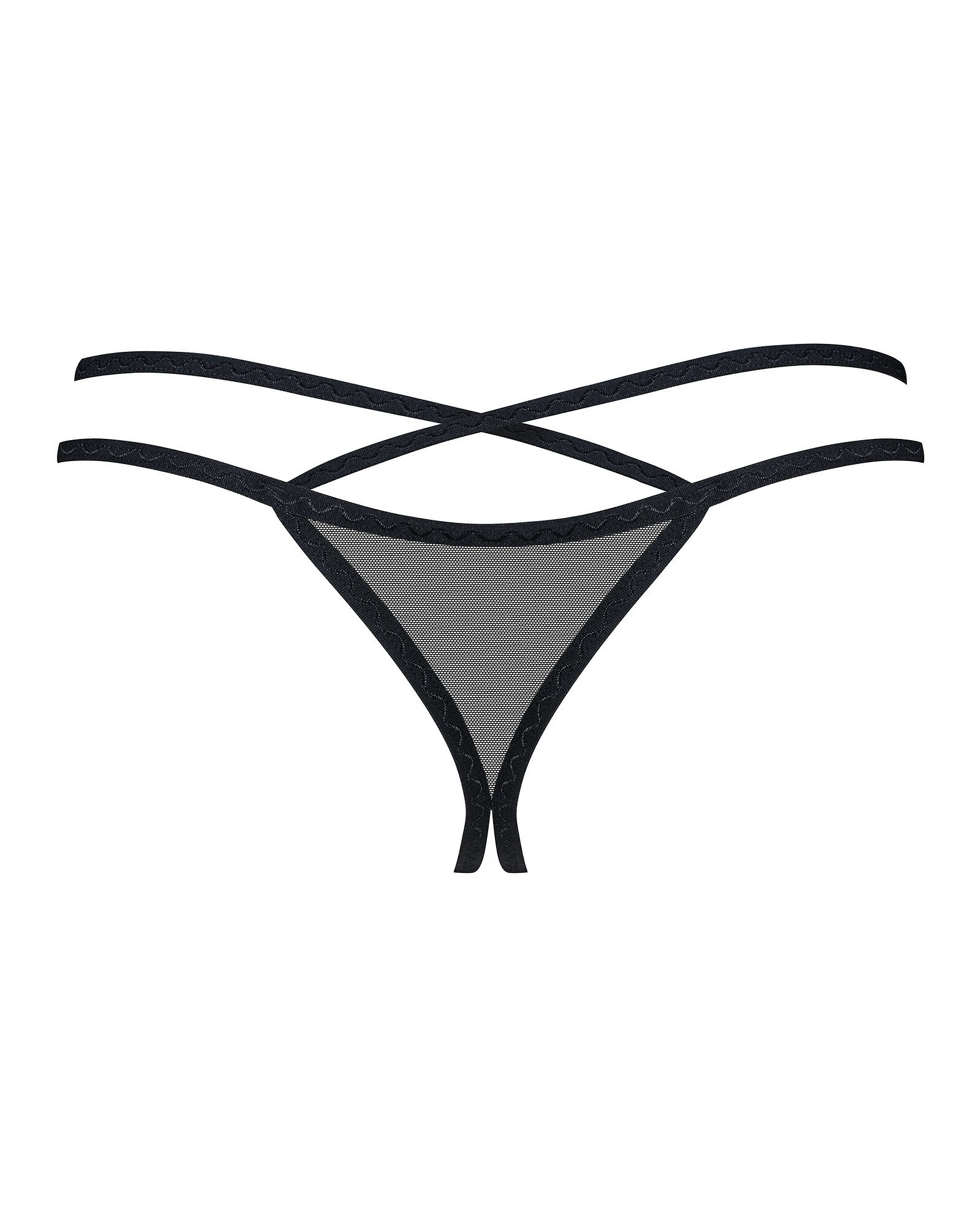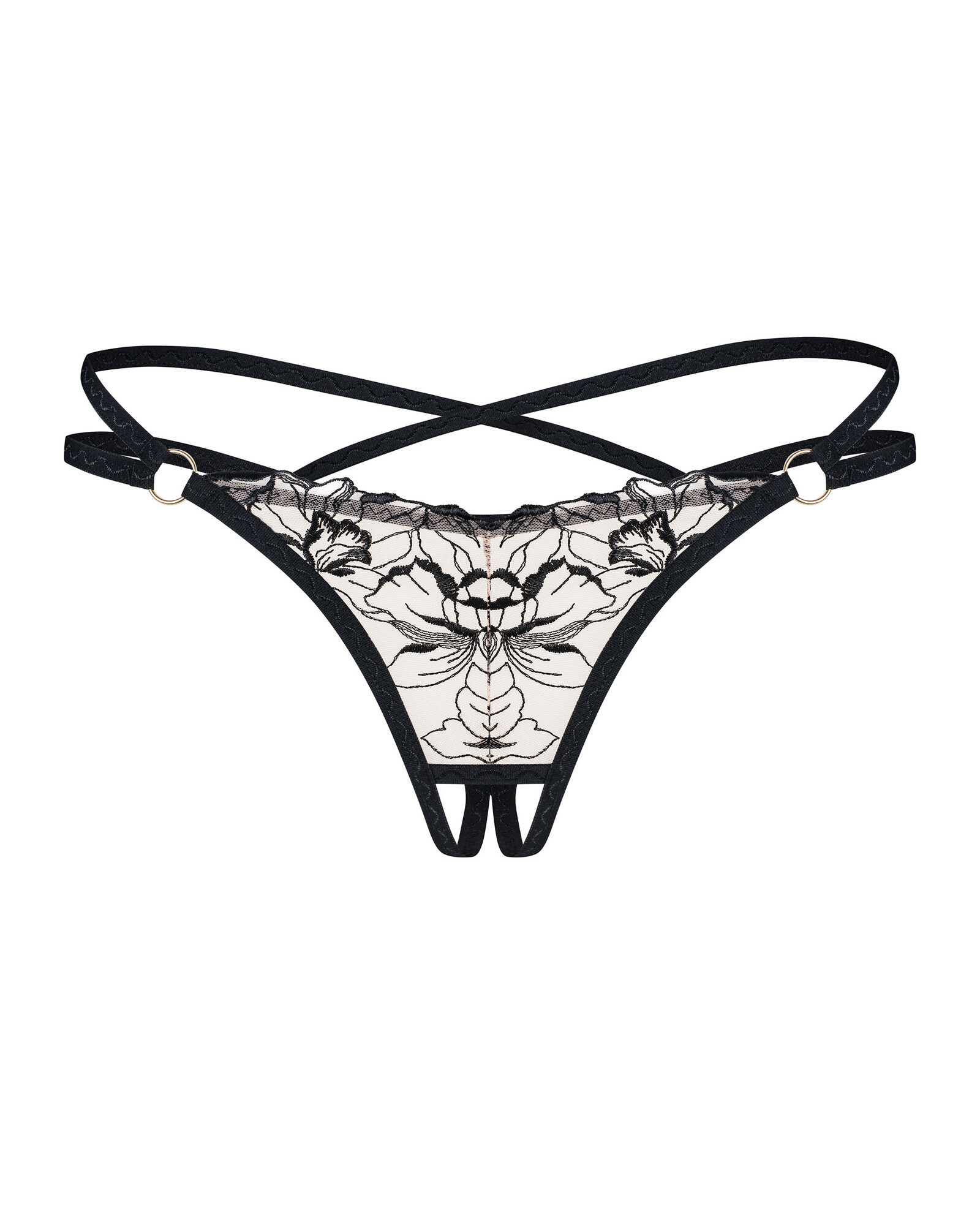 Odvážné vyjádření rafinované smyslnosti. Tanga s otevřeným rozkrokem z průsvitné síťoviny a jemného béžového tylu. Zdobená propracovanou květinovou výšivkou. Vychutnejte si objetí elastických ramínek, která zaručují pohodlí při každém nošení. Oslnivé zlaté detaily dodávají nádech luxusu.