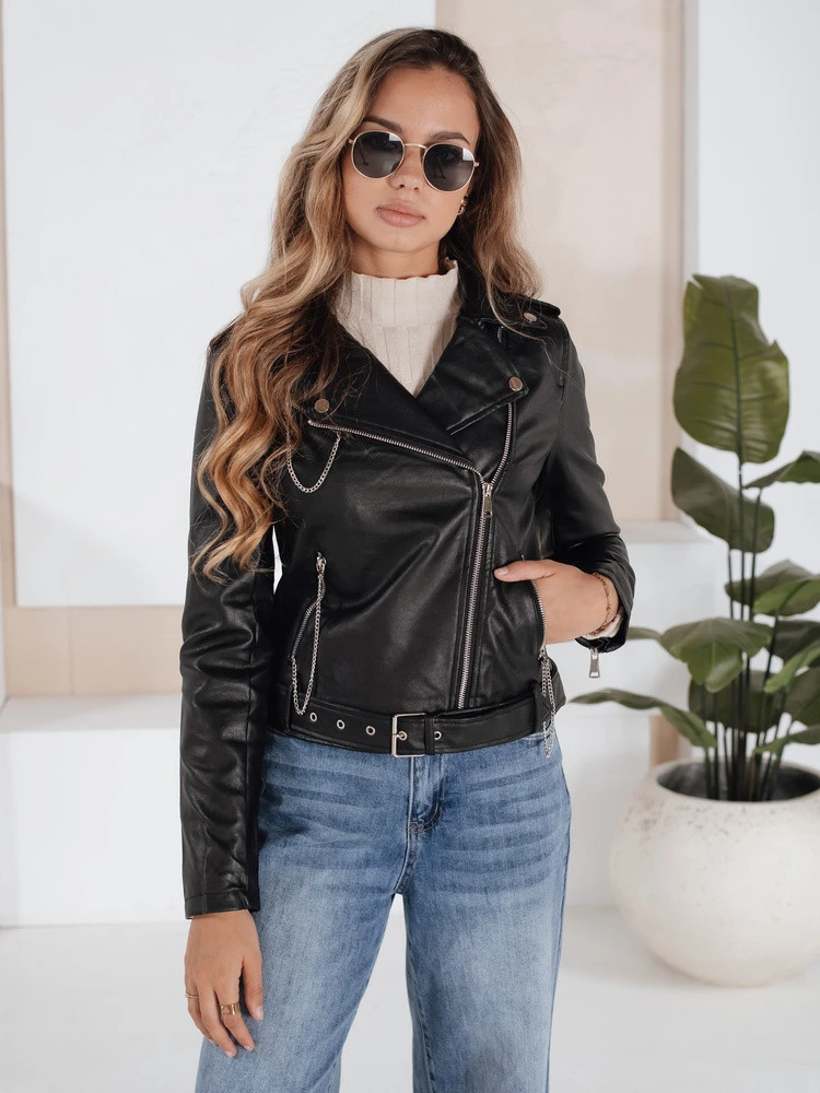 Tato dámská bunda z ekokůže ramone kombinuje klasický střih s moderním zpracováním. Asymetrické zapínání, široký límec s klopami a ozdobné řetízky na kapsách jí dodávají jedinečný charakter. Přiléhavý střih a pásek v pase zvýrazňují siluetu, zatímco podšívka poskytuje pohodlí v chladnějších dnech.