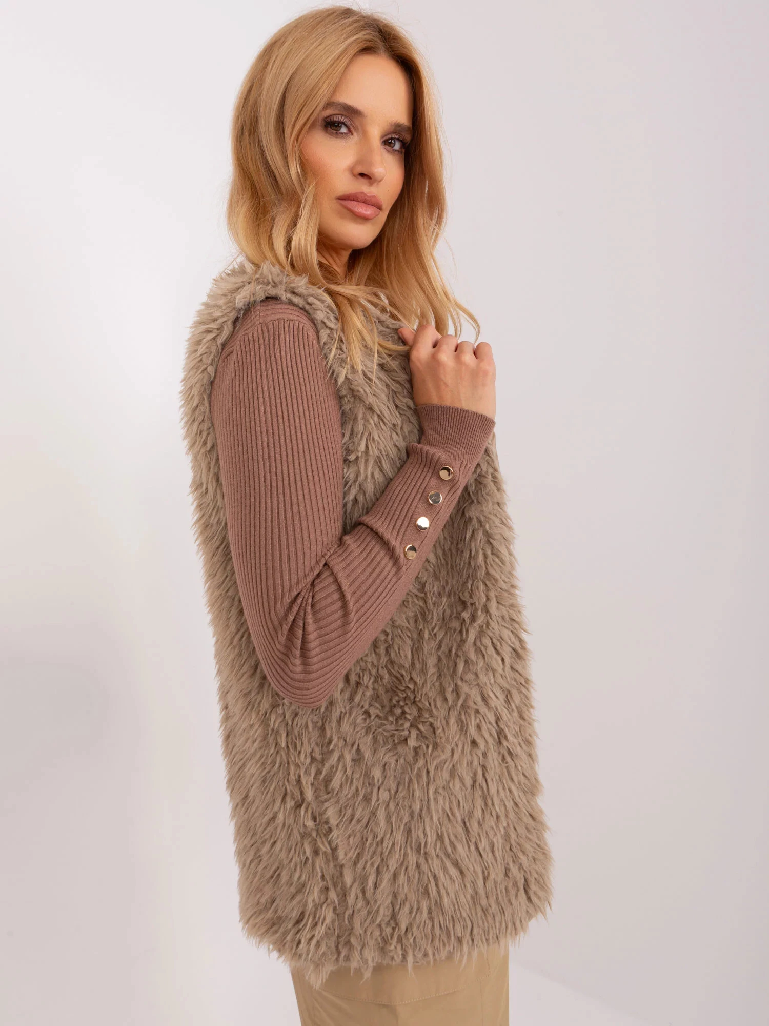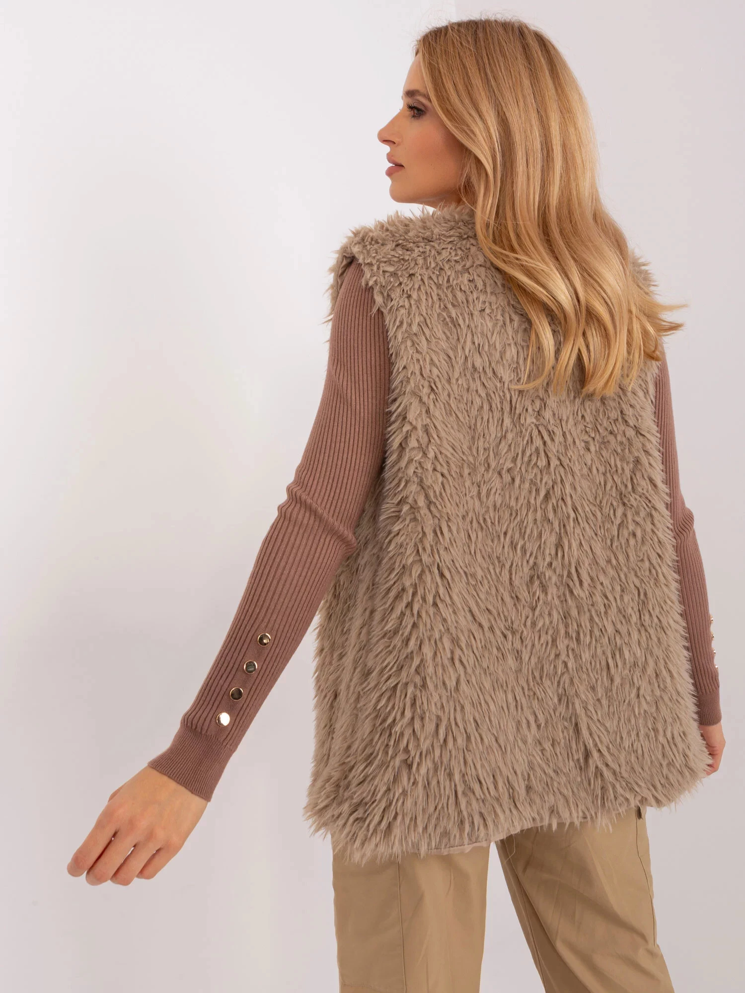 Wymiary kamizelki w rozmiarze S mierzone na płasko: szerokość pod pachami - 44 cm, długość całkowita - 69 cm