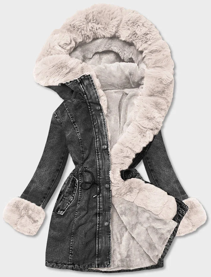 DAMSKA KURTKA JEANSOWA NA FUTRZANEJ PODSZEWCE CZARNA-ECRU (B8068-1046)