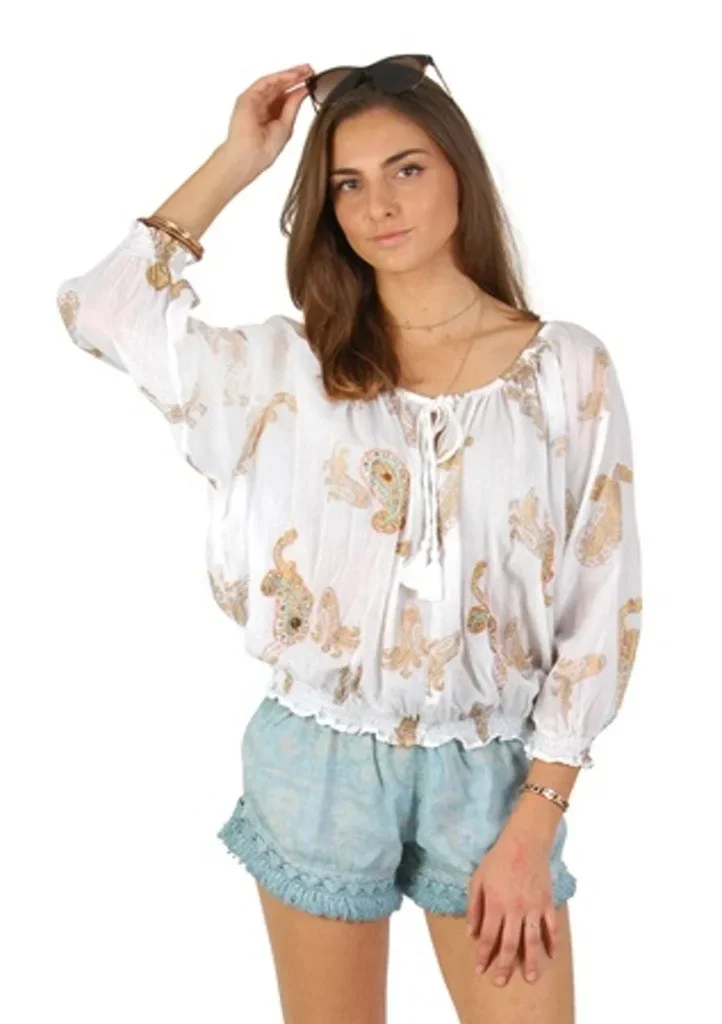 Mladistvý svůdný cropp top s širokým výstřihem, který lze stáhnout na ramena a regulovat šňůrkou se střapečky. Pro dámskou letní tuniku - top s 3 širokými, řasenými rukávy ukončenými gumičkou najdete široké využití. Zlatý potisk poloprůhledné tuniky je krásně doplněn korálkovou výšivkou.