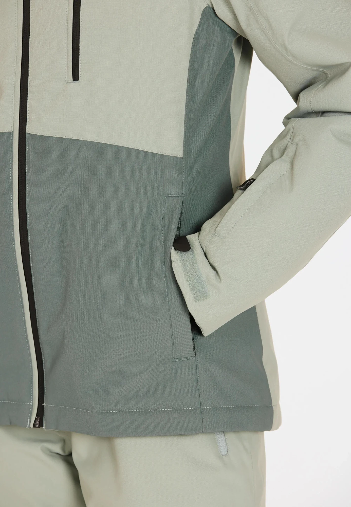 Bunda je vybavena několika kapsami – dvěma postranními na zip, náprsní kapsou a speciální kapsou na skipas.