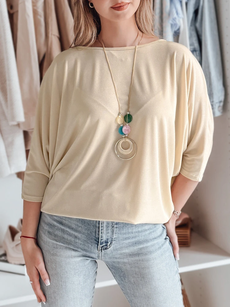 Stylová halenka s volným oversize střihem, vyrobená z lehkého materiálu, který krásně sedí na siluetě. 3/4 rukávy zakončené ladícími manžetami podtrhují moderní design a přiložený jemný přívěsek je jedinečným doplňkem. Ideální k džínům, sukním a elegantním kalhotám.