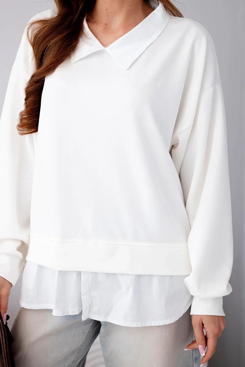 Stylová dámská mikina s nápadným vložením ve stylu košile je ideální kombinací elegance a pohodlí. Model kombinuje klasický střih mikiny s přišitým spodním dílem napodobujícím košili a límečkem, což vytváří módní vrstvený efekt bez nutnosti nosit dva samostatné kusy oblečení.
