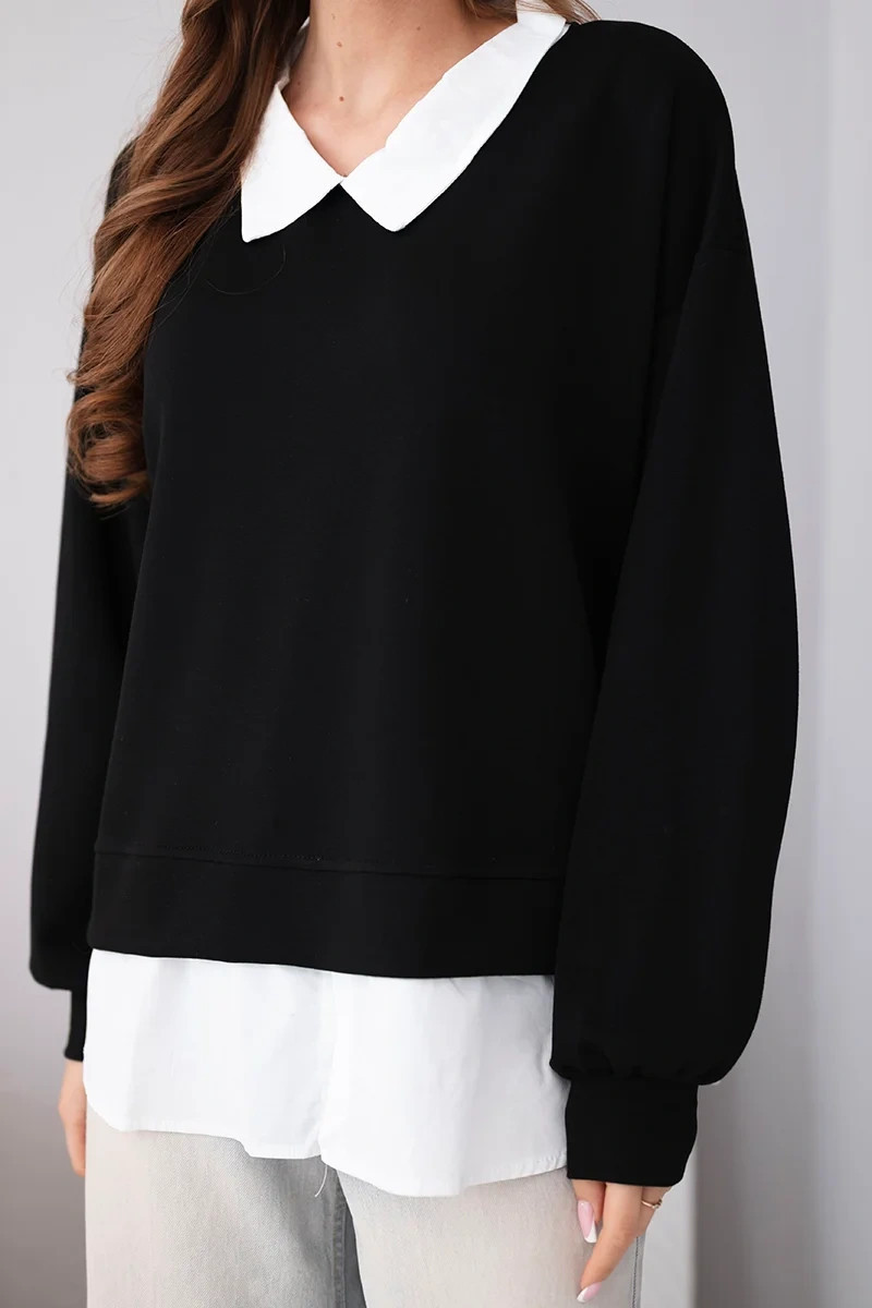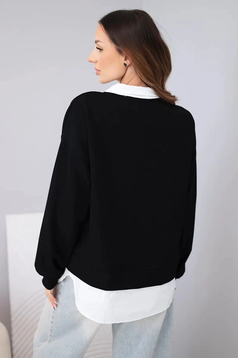 Stylová dámská mikina s nápadným vložením ve stylu košile je ideální kombinací elegance a pohodlí. Model kombinuje klasický střih mikiny s přišitým spodním dílem napodobujícím košili a límečkem, což vytváří módní vrstvený efekt bez nutnosti nosit dva samostatné kusy oblečení.