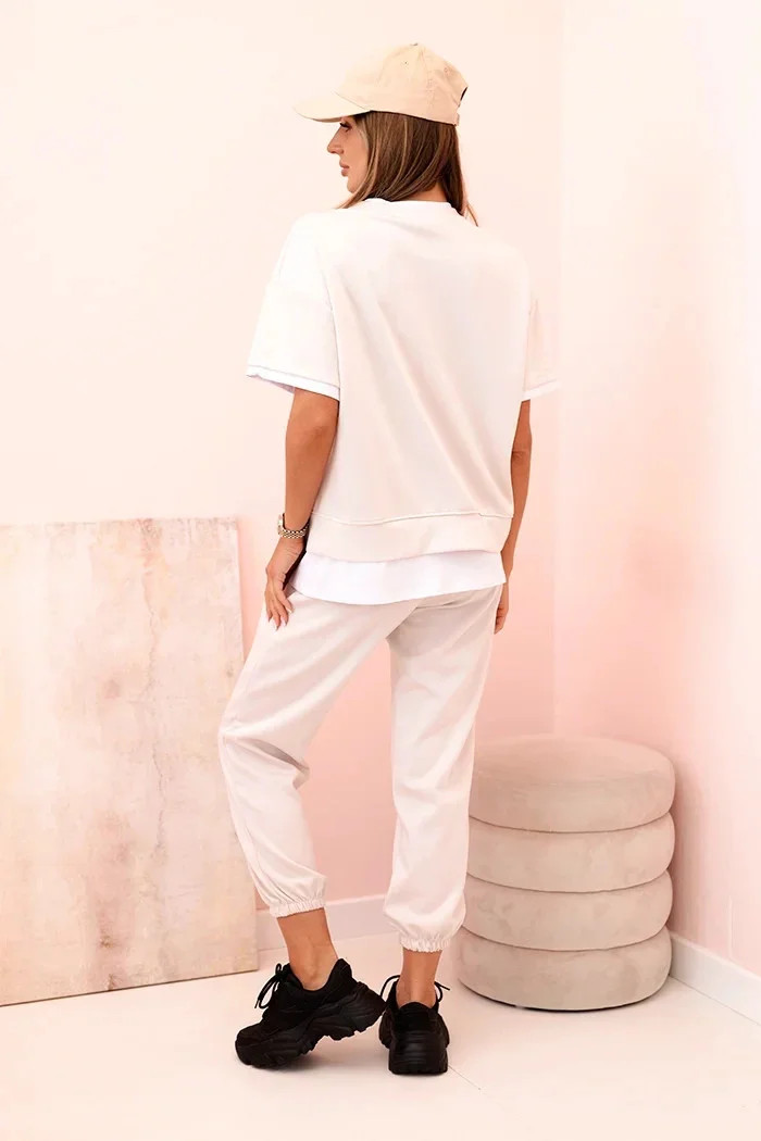 Tato dámská tepláková souprava je ideální volbou pro ženy, které si cení pohodlí, módního vzhledu a funkčnosti v každodenním oblékání. Skládá se z volné halenky s krátkým rukávem a módním dvojitým lemem a pohodlných kalhot s elastickým pasem a šňůrkou, díky čemuž se perfektně přizpůsobí postavě. Materiál s příměsí elastanu zajišťuje pružnost a pohodlí po celý den a moderní střih zaručuje, že souprava bude skvělá jak na domácí relax, tak na procházku či setkání s přáteli. Ležérní styl, univerzální použití a volný střih dělají z této soupravy skvělou volbu pro každou neformální příležitost. Italská výroba je zárukou kvality a důrazu na detaily. Velikost je univerzální a bude vyhovovat ženám velikostí S, M nebo L.