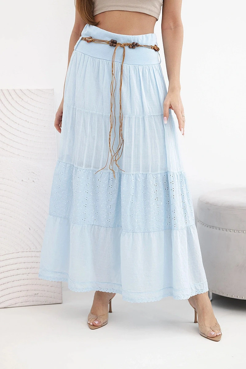 Dámská maxi bavlněná sukně s ažurovou výšivkou a elastickým pasem modrá