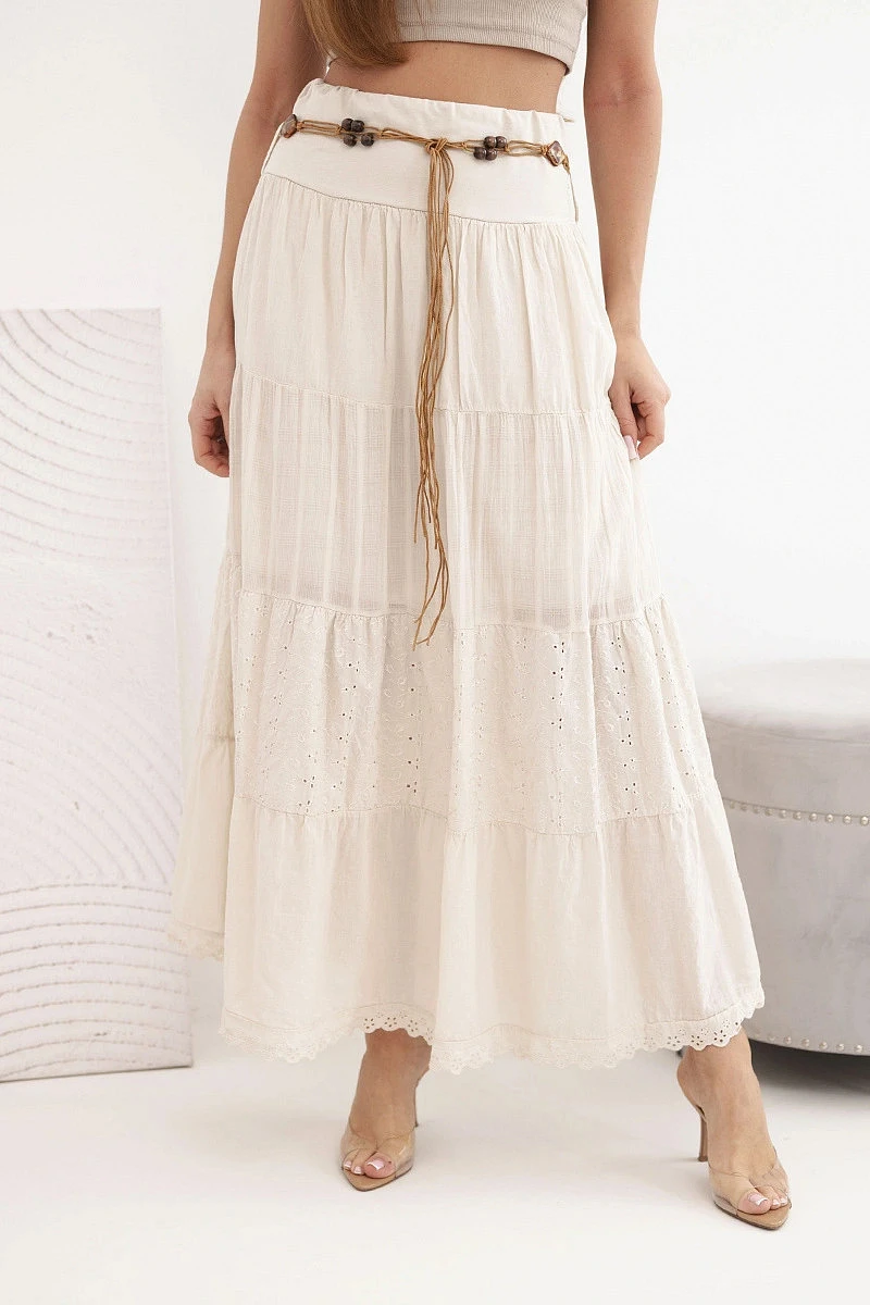 Dámská maxi bavlněná sukně s ažurovým vyšíváním a elastickým pasem béžová