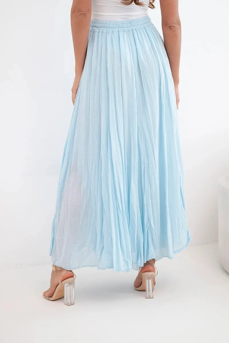 Vzdušná dámská maxi sukně je ideální volbou pro teplé dny. Model vyrobený ze 100% bavlny je lehký, prodyšný a velmi pohodlný na nošení. Jemně nařasený materiál dodává sukni módní, přirozený charakter a při pohybu se krásně vlní.