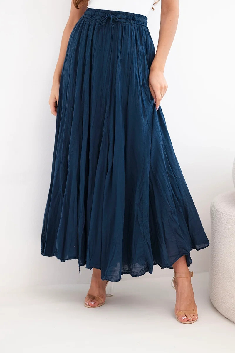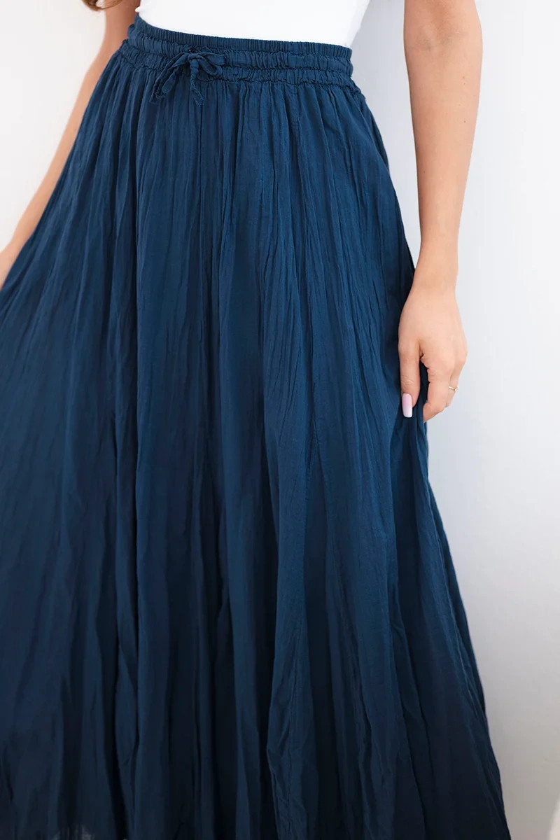Vzdušná dámská maxi sukně je ideální volbou pro teplé dny. Model vyrobený ze 100% bavlny je lehký, prodyšný a velmi pohodlný na nošení. Jemně nařasený materiál dodává sukni módní, přirozený charakter a při pohybu se krásně vlní.