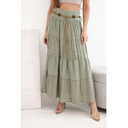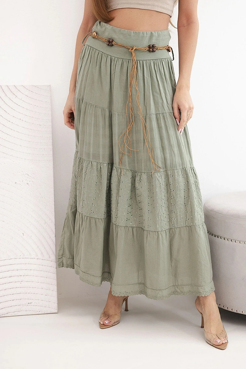Dámská maxi bavlněná sukně s krajkovou výšivkou a elastickým pasem khaki