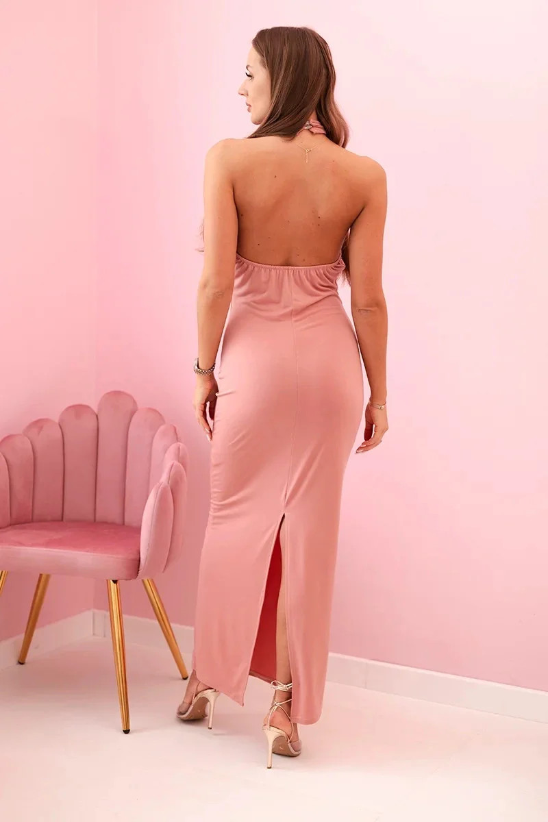 Dámská maxi šaty s odhalenými zády a řasením - tmavě růžová
