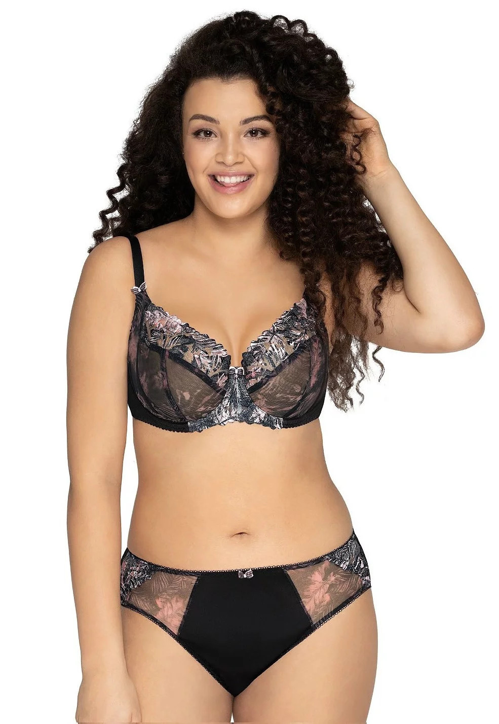 Košíčky modelu jsou vyrobené ze síťoviny s barevnými květy a jsou zpevněné kosticemi. Vrchní linii modelu tvoří efektní výšivka s květinovým motivem s lesklou přízí. Vnitřní strana košíčků je podšitá vrstvou síťoviny. Ramínka je možné nastavit, ale nelze je odepnout. Šířka ramínek závisí na velikosti a rozměru podprsenky. Model stabilně nadnáší poprsí, poskytuje mu oporu a dodává mu pěkný přirozený tvar. Podprsenka má střih a konstrukci typu 1130.