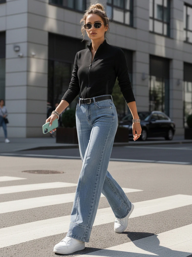 - Střih do boků - dobře se kombinuje s džínami a kalhotami s vysokým pasem.