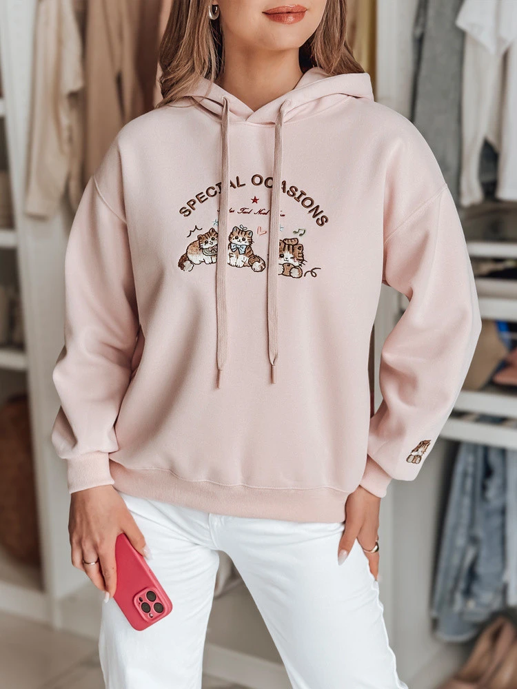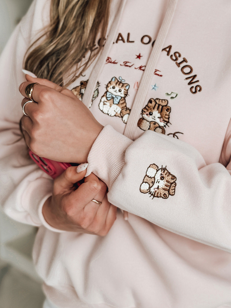 Tato dámská mikina oversize je kombinací pohodlí a stylu, která je ideální pro jarní stylizaci. Univerzální velikost padne od XS do L. Poutavá výšivka s roztomilými koťátky a nápisem "SPECIAL OCASIONS" dodává celému vzhledu dívčí nádech. Výšivka se objevuje také na rukávu, což vytváří ucelený detail. Kapuce se stahovací šňůrkou, žebrované manžety a spodní lem podtrhují ležérní charakter mikiny, která je ideální pro každodenní nošení.