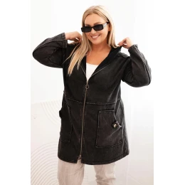 Stylová dámská mikina Plus Size s efektem destilace je nabídkou pro ženy, které mají rády pohodlí a neobvyklý styl. Model v volném střihu zajišťuje volnost pohybu a díky bavlněné tkanině se skvěle hodí na každodenní nošení. Mikina má kapuci se šňůrkami, zip po celé délce a dvě prostorné kapsy s ozdobnými knoflíky, které dodávají charakter. Surově zakončené rukávy a spodní část podtrhují její moderní styl.