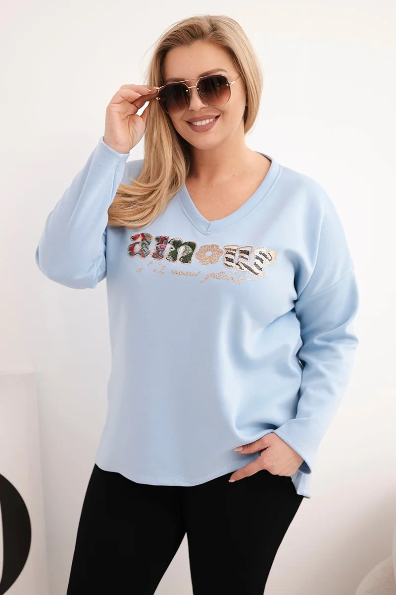 Dámská mikina Plus Size s nápisem a výstřihem do V modrá
