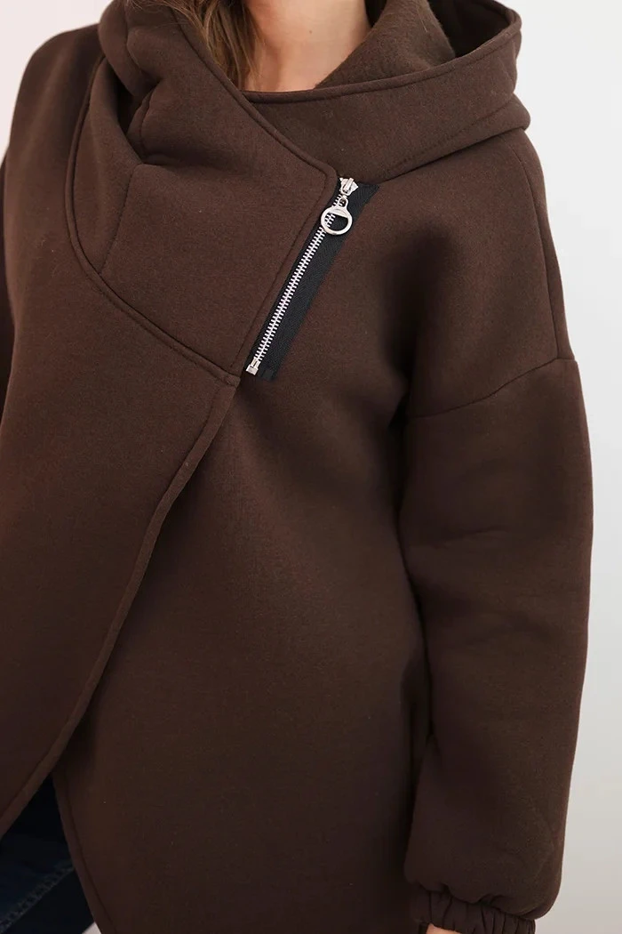 Dámská mikina s kapucí a asymetrickým zipem hnědá