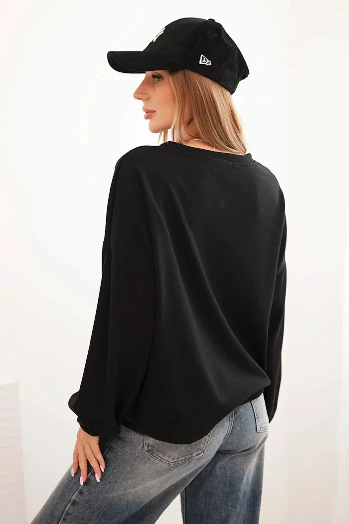 Dámská mikina s ozdobným zakončením na spodní části je kombinací pohodlí a elegance v každodenním stylu. Volnější střih zajišťuje komfort nošení a dekorativní aplikace dodává celku výjimečný charakter. Model se skvěle hodí jak k džínům, tak i k sukním, čímž vytváří stylizace na každodenní nošení i na setkání v uvolněnějším duchu.