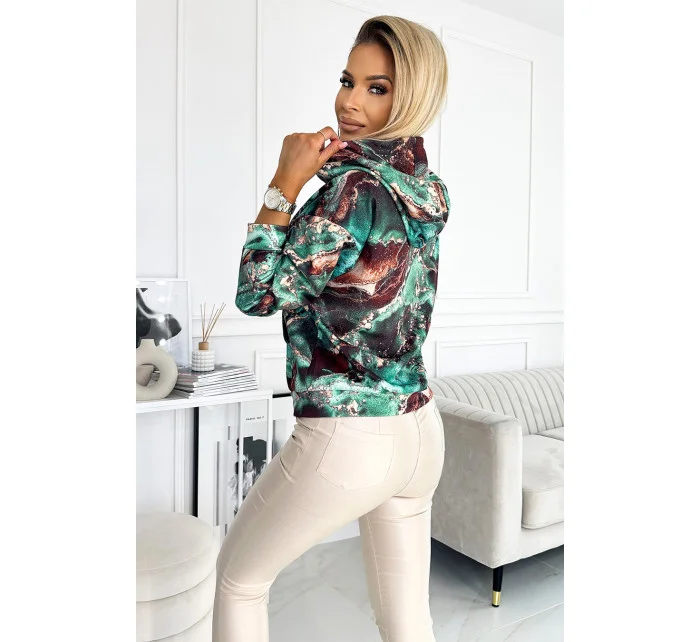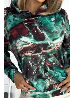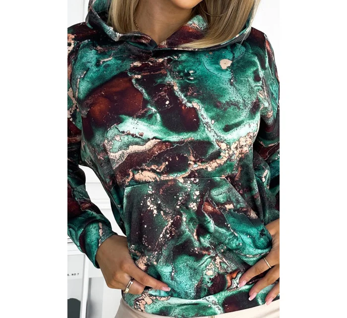 Dámská mikina s tyrkysovo-hnědým mramorovým vzorem a s kapucí 390-2