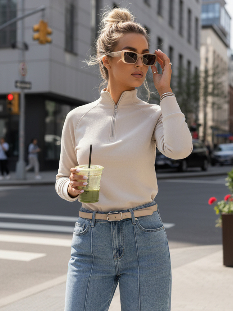 Bluza pasuje do stylizacji miejskich i casualowych, noszona z jeansami, spodniami z wyższym stanem lub legginsami. Zamek pod szyją ułatwia dopasowanie do pogody, a stójka sprawdza się podczas spacerów i w drodze do pracy.