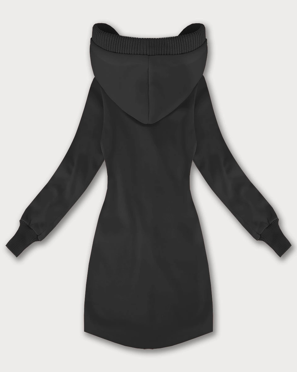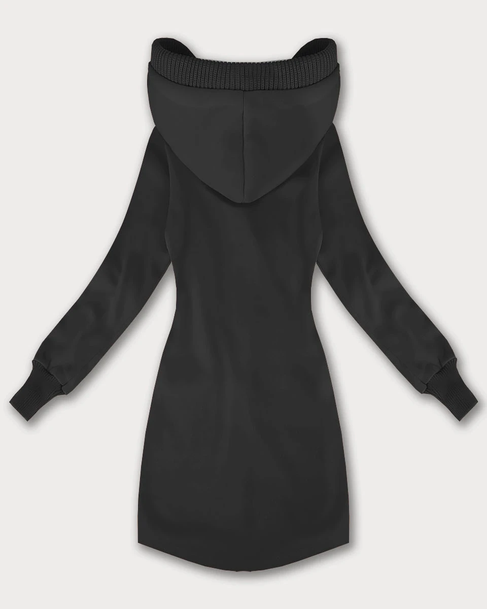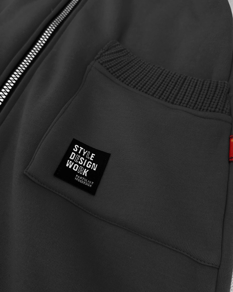 Mikina je vypasovaná, uvnitř má příjemný polar (fleece), má dvě kapsy a zapíná se zipem. Rukávy jsou olemované stahovacími lemy. Spodní okraj modelu je asymetrický. Mikina má délku pod boky.