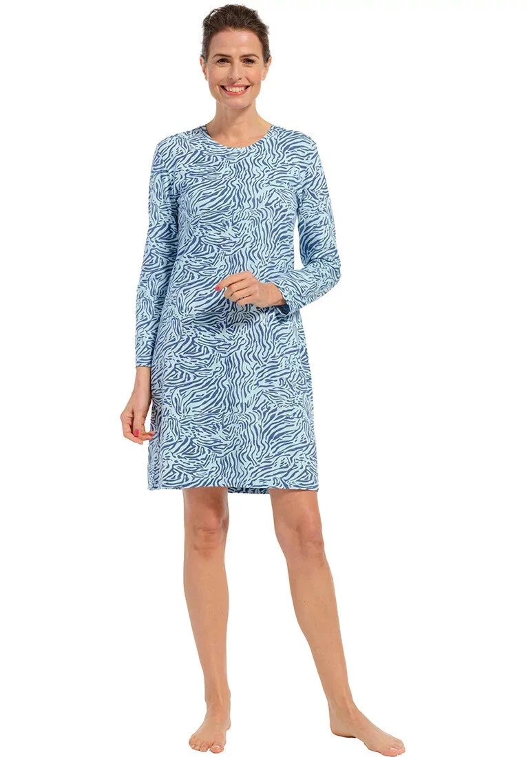 Tato noční košile je vyrobena ze směsi bavlny a elastanu a má módní celoplošný zvířecí potisk ve světle a tmavě modré barvě.