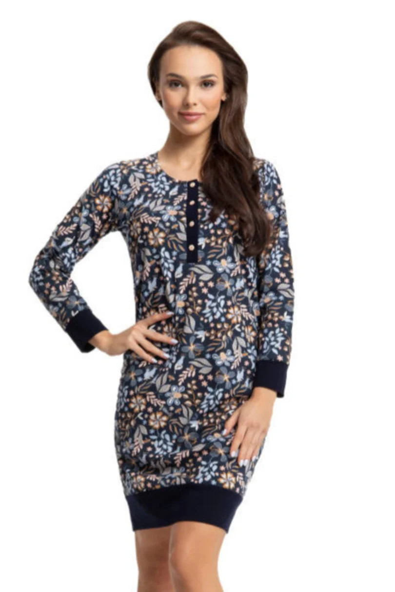 Dámská noční košile, která je vyrobená z tkaniny s květinovým rostlinným vzorem v módním barevném provedení.
