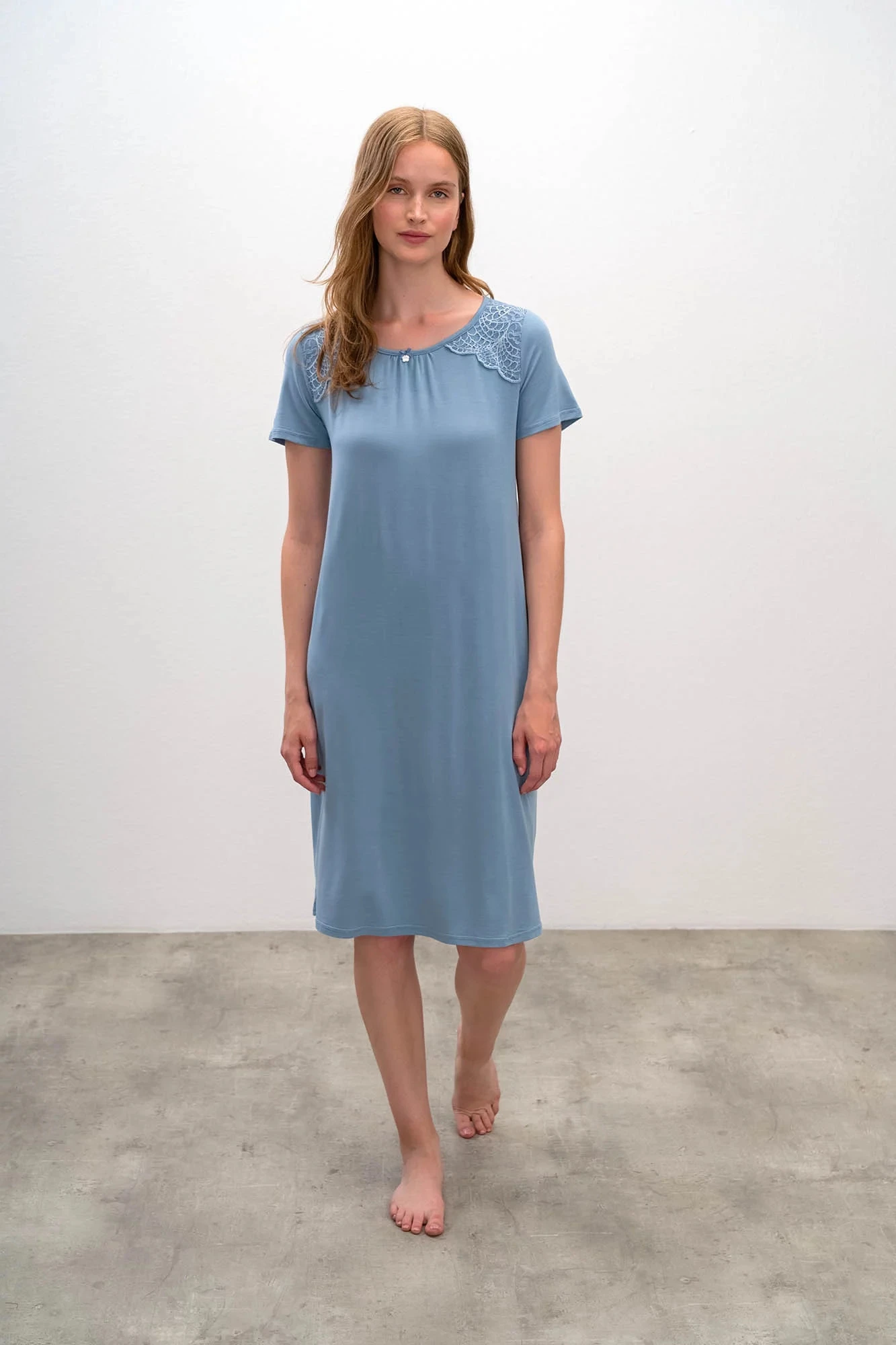 Košile s krátkým rukávem, má kulatý výstřih, zdobený krajkou. Délka ke kolenům.