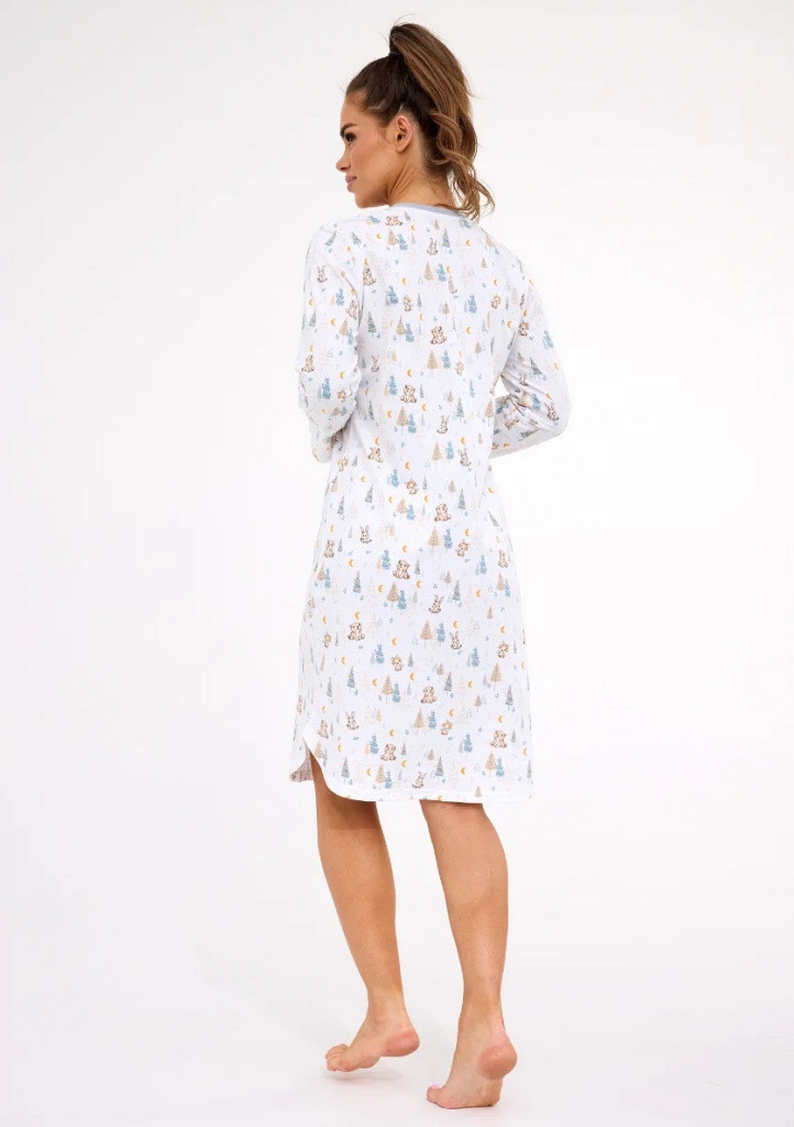 Elegantní a pohodlná dámská noční košile z kvalitní 100% bavlny, vhodná i pro kojící maminky, je vyrobena z měkké vzorované bavlněné látky, která je příjemná na dotek a vhodná pro každodenní nošení během spánku. Košilka má výstřih se zapínáním na patentky. Délka košilky je nad kolena. Vhodná pro kojící matky díky snadnému rozepnutí v přední části. Vhodná jako domácí oděv nebo noční prádlo.
