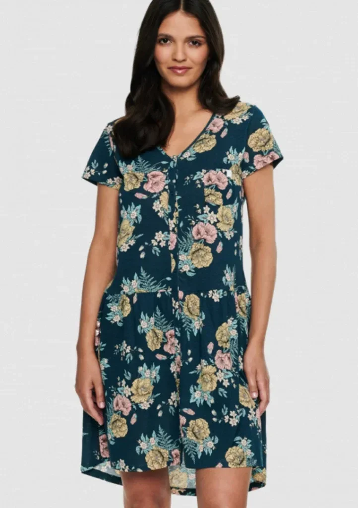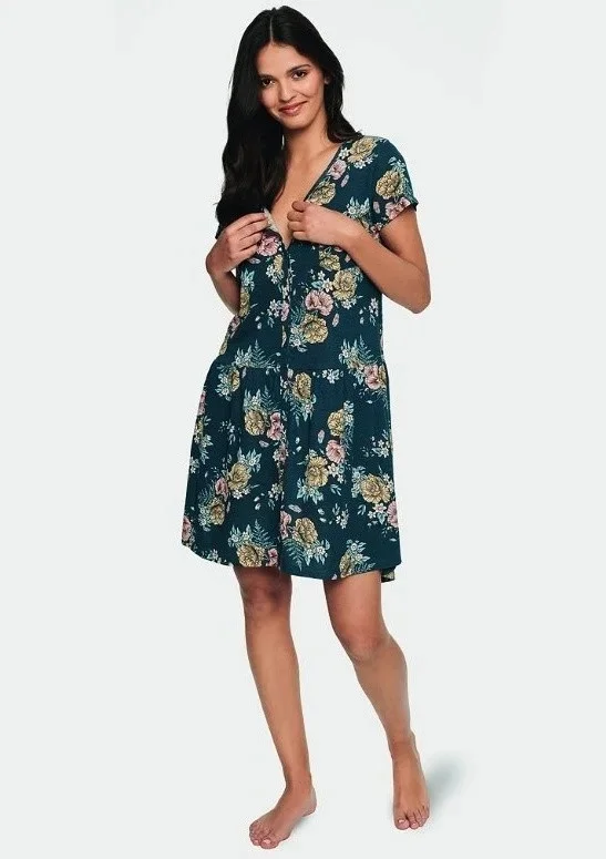 Dámská romantická noční košilka Henderson. Košilka je vyrobena z jemné a pružné bavlny. Má krátký rukávek, délku ke kolenům a hezký romantický květinový motiv. Košilka je po celé své délce propínací