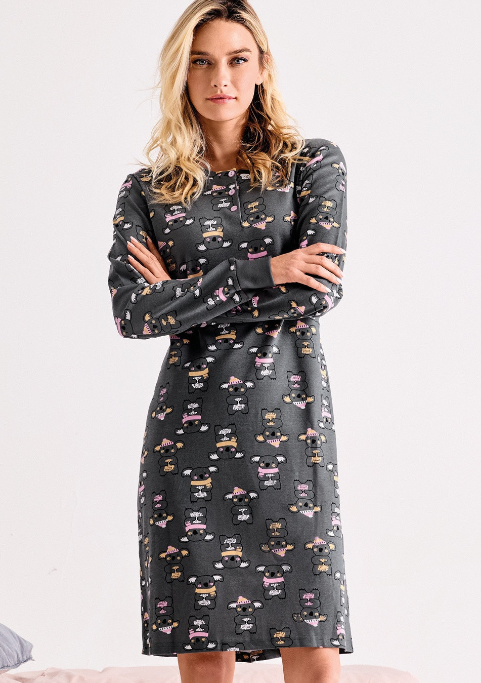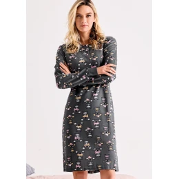 Dámská vzorovaná noční košile italské značky Infiore. Košile má dlouhý rukáv, který je ukončený úplety. Délka košile je nad kolena. Košile má légu na tři knoflíky. Košile je ušitá z velmi příjemné hřejivé bavlny.